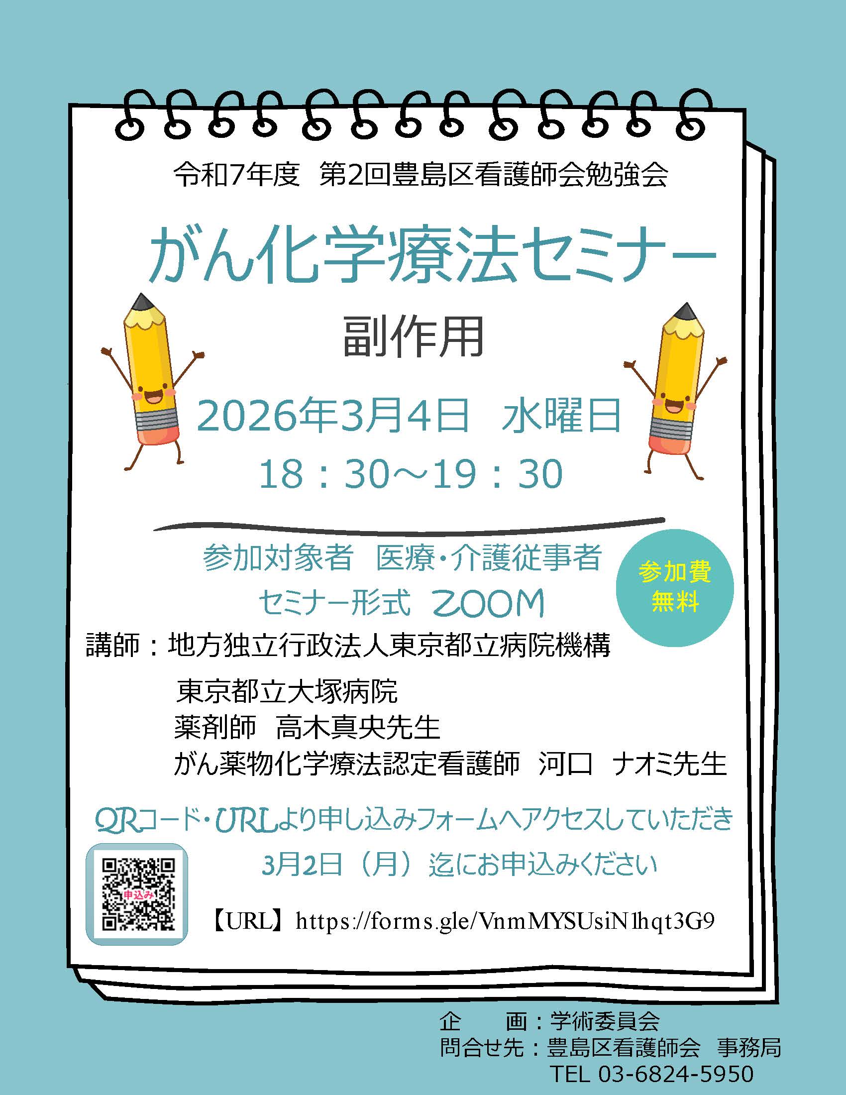 3月4日に第2回豊島区看護師会勉強会として、立大塚病院のがん薬物療法認定看護師と薬剤師による勉強会を開催いたします。