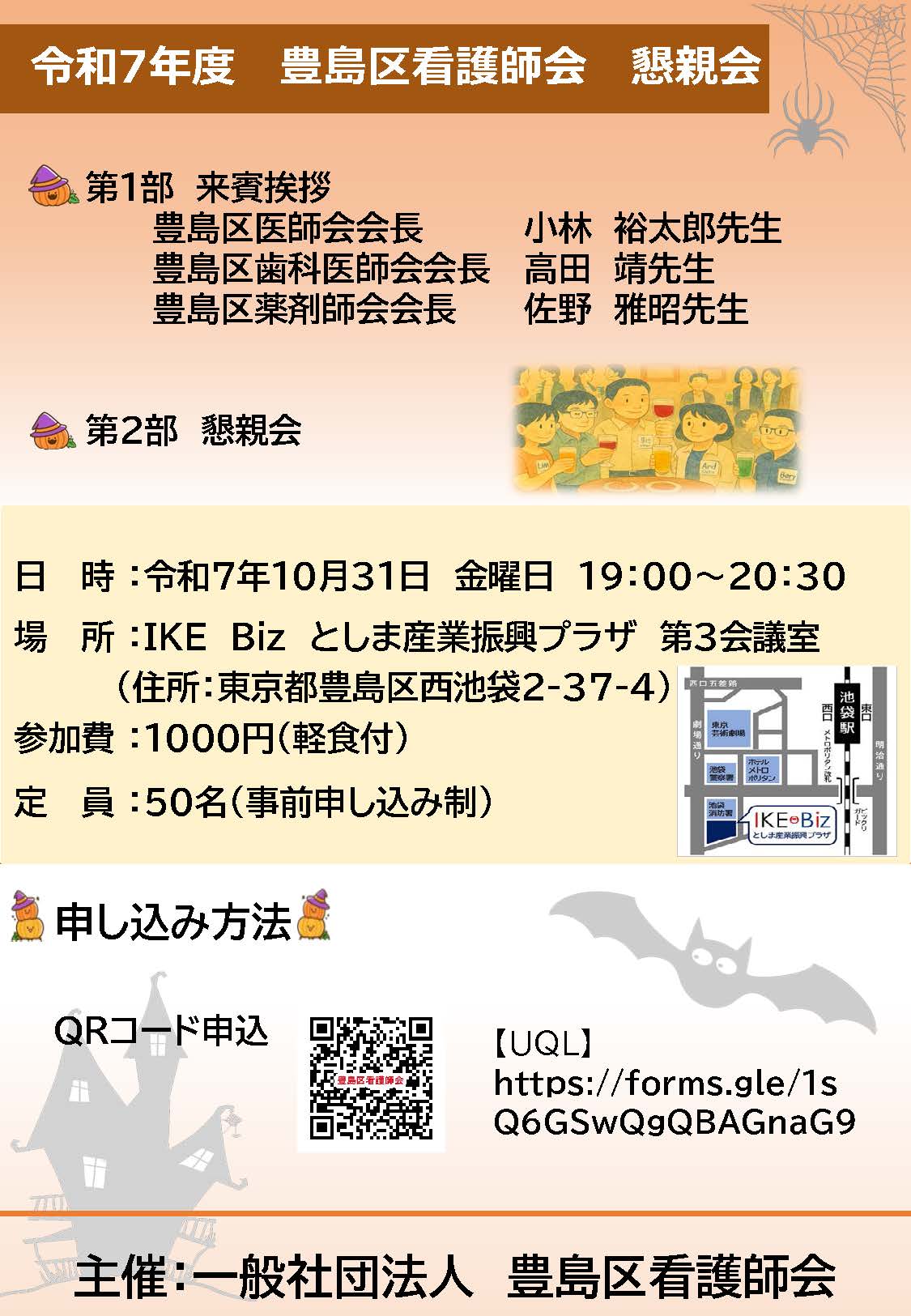 2025年10月17日 / 最終更新日時 : 2025年10月17日 admin 活動報告 💡豊島区看護師会からのお知らせ💡 いつも当会の活動にご協力いただき心から感謝申し上げます。 10月31日に懇親会を行います。 会員の皆様や豊島区看護師会への入会をご検討されている皆さまのご参加をお待ちしております! (お申し込みは下記チラシにあるGoogleフォームのQRコードまたはURLからお願い致します。) また後日、懇親会の様子をこちらでご報告する予定です。お楽しみに✨ 今後も活動をホームページで適宜ご紹介していきます。